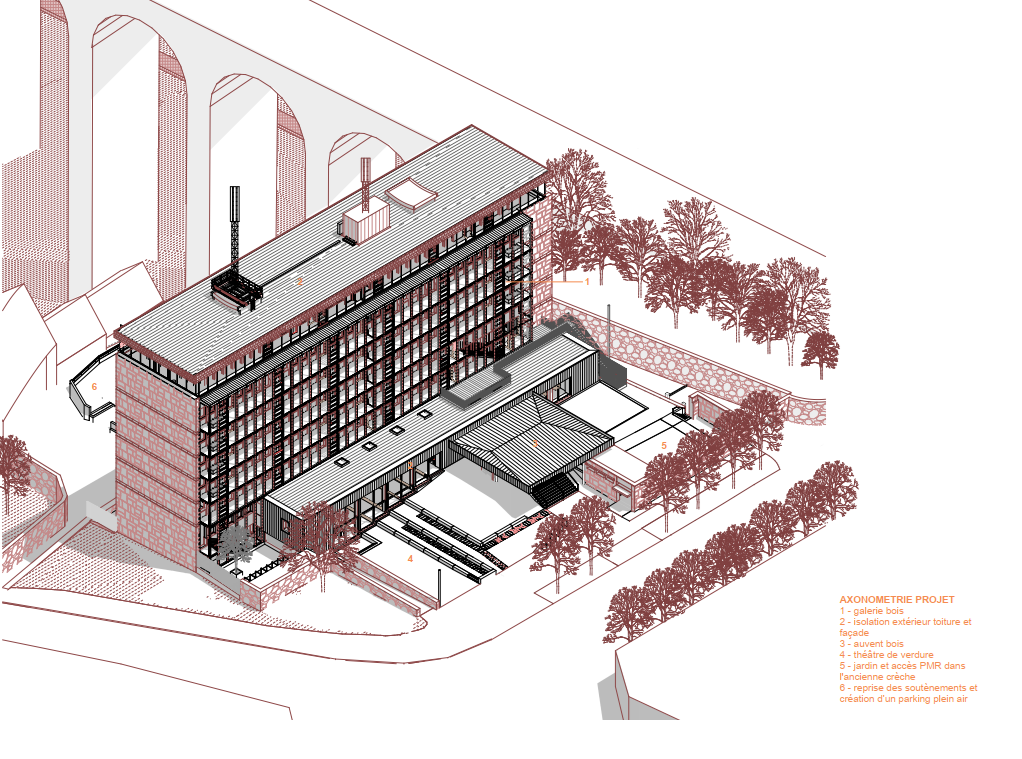 livraison 2025 – localisation Saint-Brieuc, Côtes-d’Armor – label EnerPHit – surface de référence énergétique 5 202 m² – coût des travaux 10 300 000 euros HT – besoins de chauffage 20 kWh/(m²a) – besoins de rafraîchissement et de déshumidification 4 kWh/(m²a) – puissance de rafraîchissement 11 W/m² – fréquence d’humidité excessive 0 % – test d’infiltrométrie n50 = 0,7/h – consommation d’énergie primaire 116 kWh/(m²a) – consommation d’énergie primaire renouvelable 58 kWh/(m²a) – murs extérieurs U = 0,218 W/(m²K) – dalle U = 0,162 W/(m²K) – toiture U = 0,152 W/(m²K)