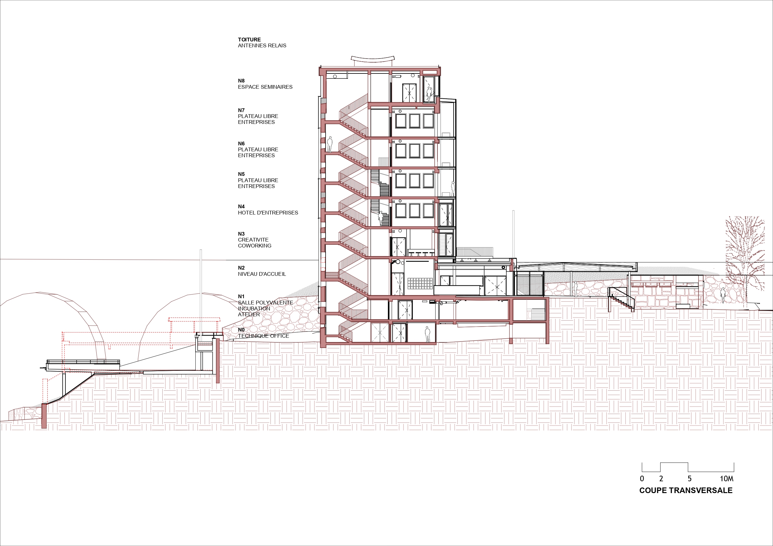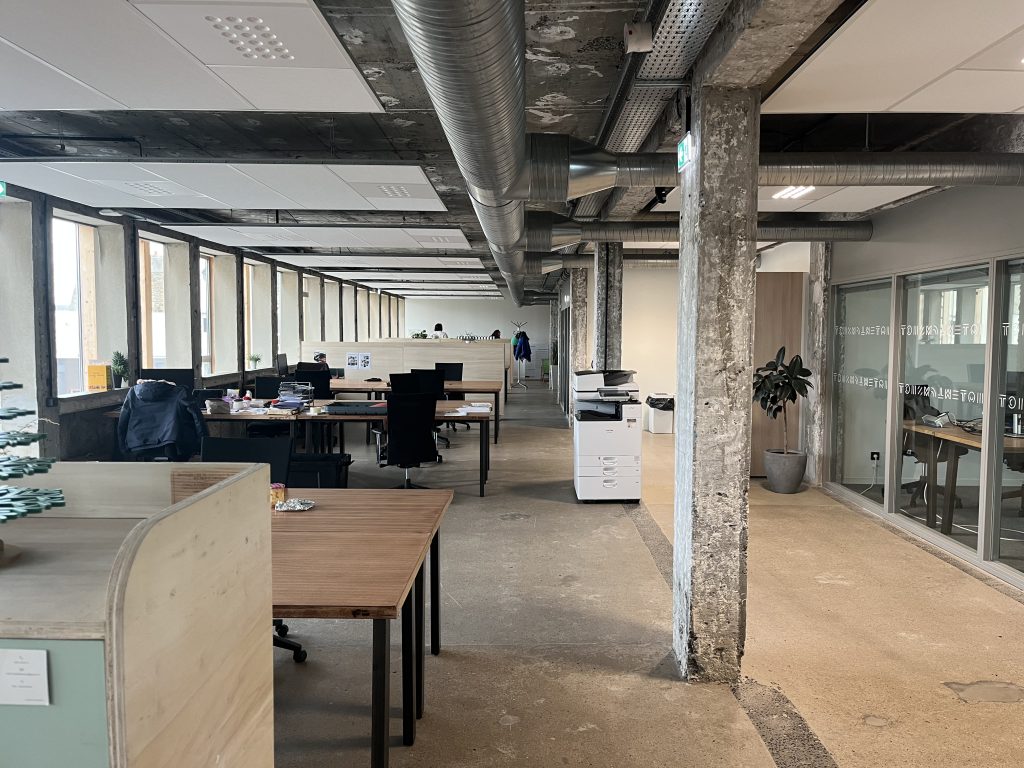 Atteindre le standard Passivhaus est une ambition qui se décide dès l’esquisse. Sauf à avoir parfaitement assimilé la méthode de conception passive et à faire preuve d’une rigueur sans faille tout au long du chantier… C’est précisément ce qu’a réussi l’équipe pilotée par nunc architectes, entourée des bureaux d’études Hinoki (fluides et thermique) et Wigwam (étanchéité à l’air) : transformer les anciens bureaux de la CAF de Saint-Brieuc en hôtel d’entreprises-coworking labellisé EnerPHit quand bien même la certification passive n’était à proprement parler pas visée avant l’obtention des résultats du premier test d’étanchéité à l’air. Une prouesse peu commune mais finalement alignée avec l’histoire de ce bâtiment marqué par les imprévus et les tâtonnements. Dessiné par l’architecte rennais Jean Lemercier et emblématique des années 1960 avec ses pignons en granit, il est en effet abandonné en 2013, mais reste utilisé par plusieurs opérateurs de télécommunication qui ont installé leurs antennes sur son toit. Il échoit ensuite à Saint-Brieuc Armor Agglomération qui lance, en décembre 2021, un concours pour le transformer en incubateur de start-ups, avant que le programme n’évolue à nouveau.