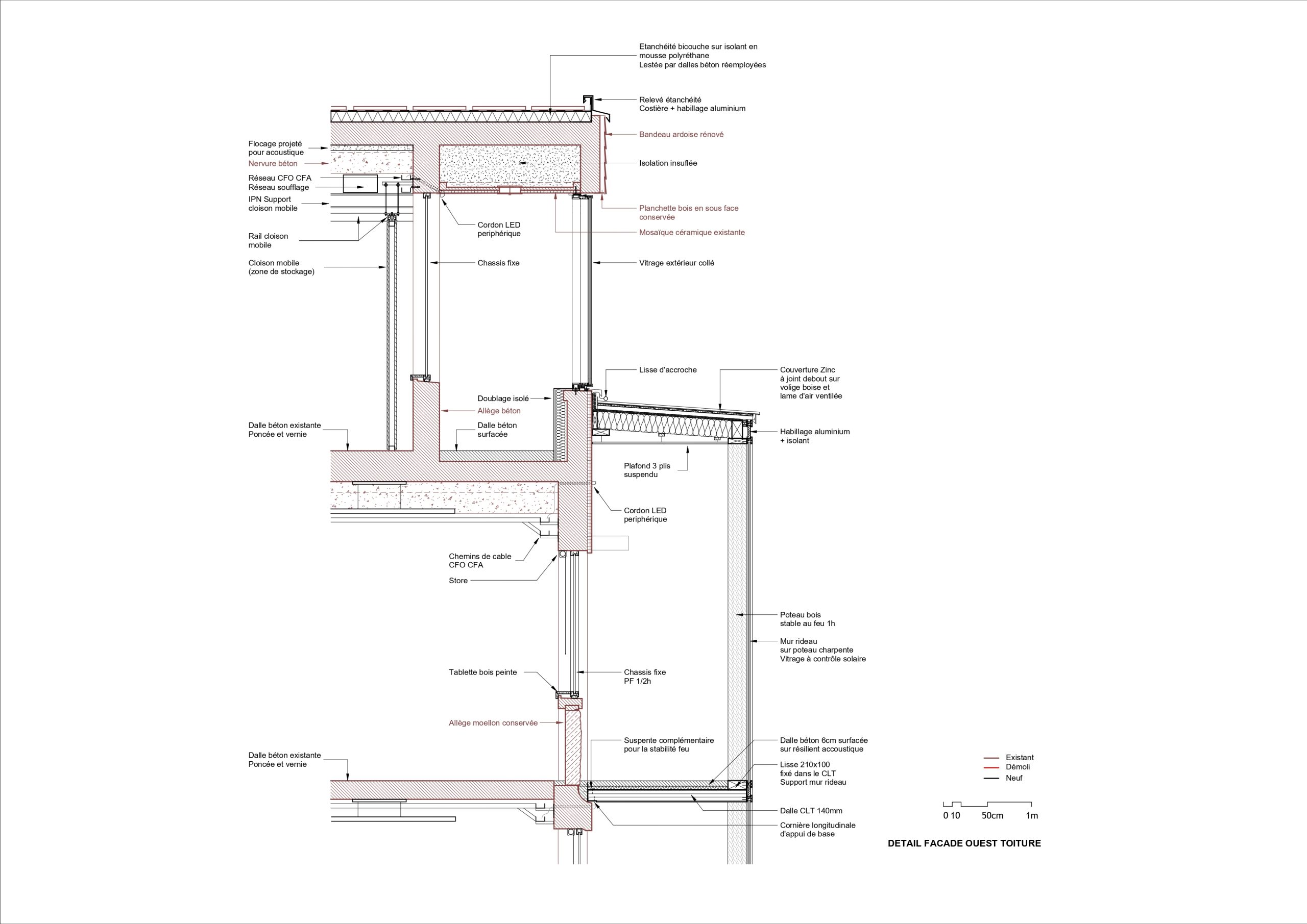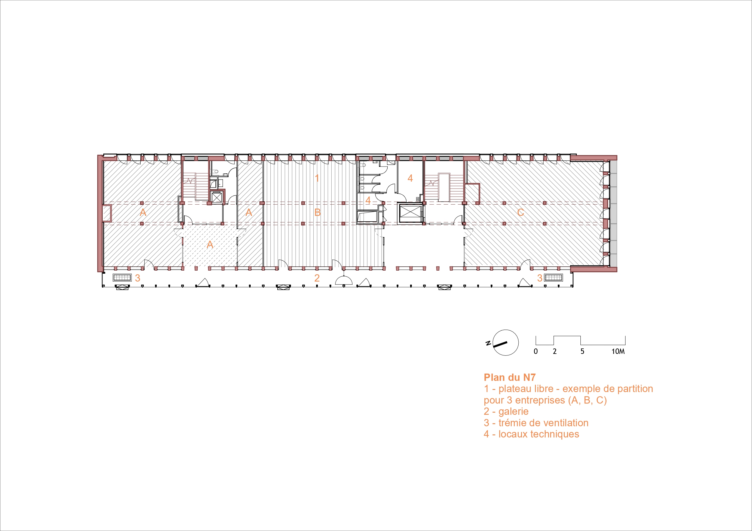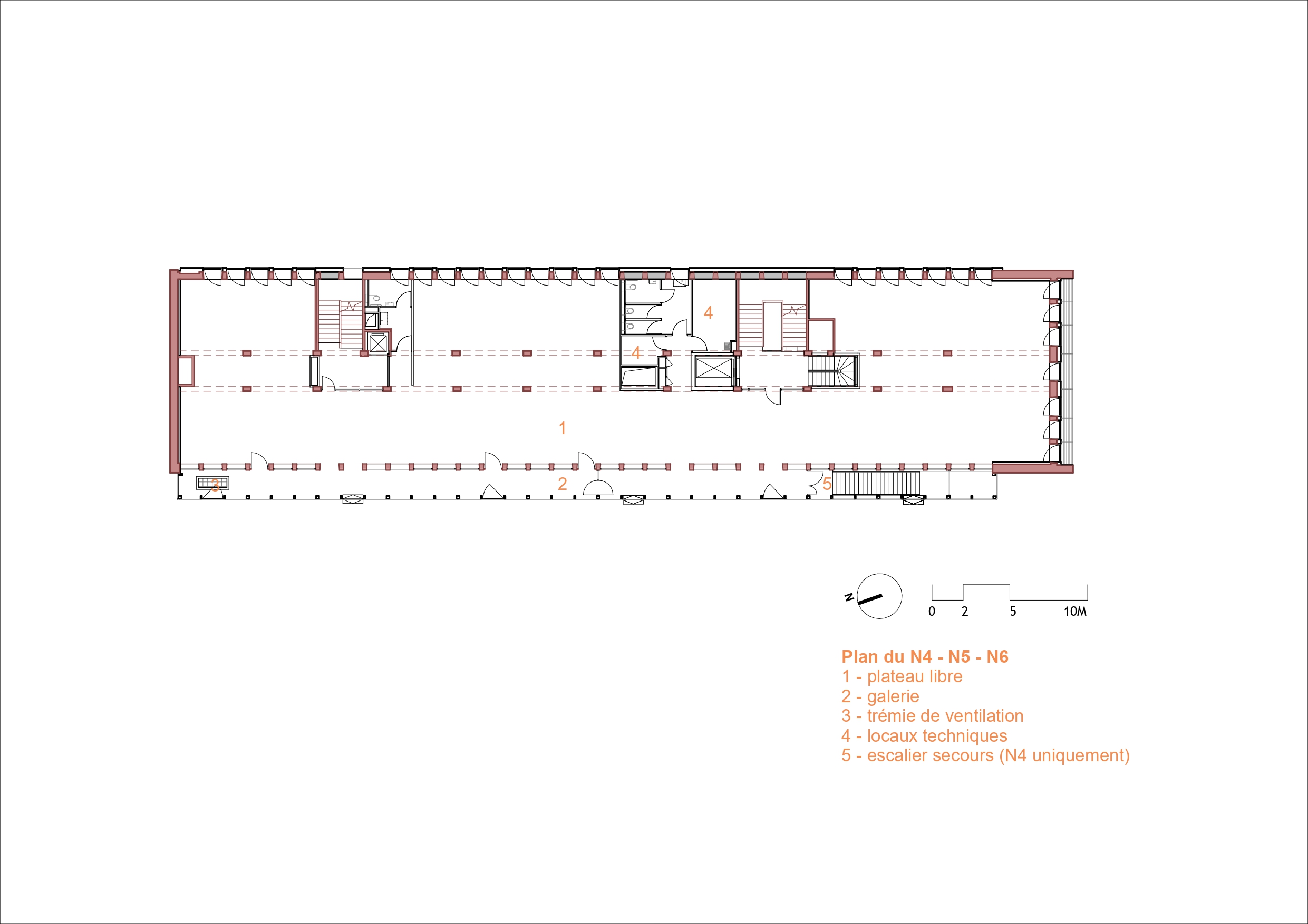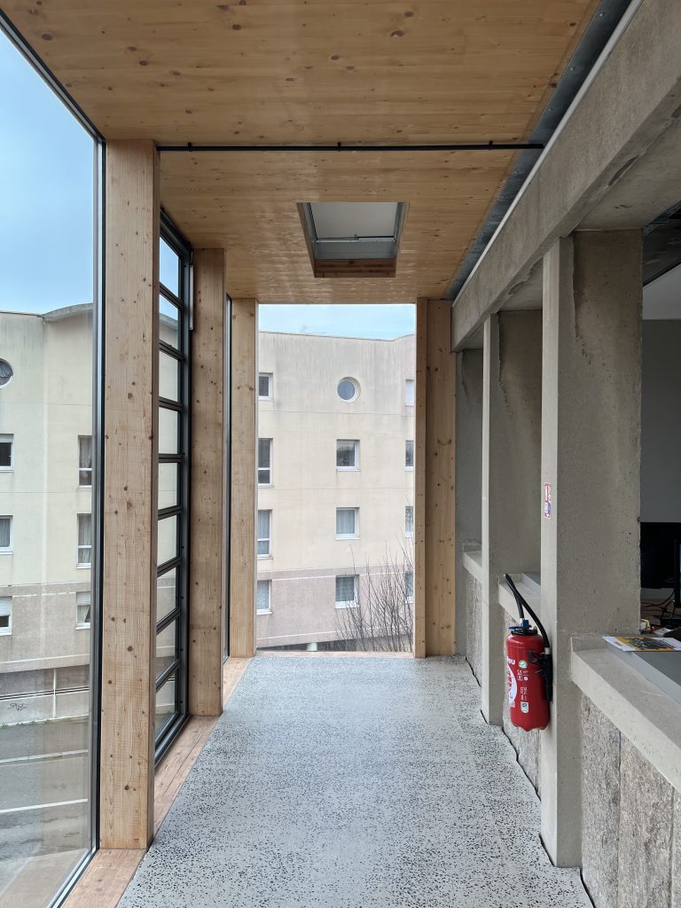 « Dès le début, notre effort s’est porté sur la question suivante : comment réaliser un bâtiment polyvalent et confortable tout en respectant un budget initial très serré ? », contextualise Pierre Béout, co-fondateur de nunc architectes. La réponse, les concepteurs la trouvent en dosant leurs efforts, en analysant finement l’existant pour intervenir avec justesse et sobriété. « Nous avions affaire à un bâtiment assez mince, profond de 13 mètres seulement. Or, à chaque étage, un grand couloir central desservait de part et d’autre des bureaux exigus et cloisonnés. De plus, les escaliers complètement ouverts sur les circulations ne permettaient pas de respecter facilement les normes incendies en vigueur. » Les équipes de nunc architectes ont donc l’idée de déporter l’ensemble des circulations en dehors du volume originel, dans une double-peau en ossature bois accolée contre la façade principale, à l’ouest. Les bénéfices de cette nouvelle coursive sont multiples : libérer les différents plateaux – lesquels peuvent désormais être aménagés à l’envi pour embrasser des usages plus contemporains (open spaces, flex offices, salles de réunions, etc.) – ; respecter l’esprit de la façade de Jean Lemercier ; et enfin maximiser les apports solaires passifs.
